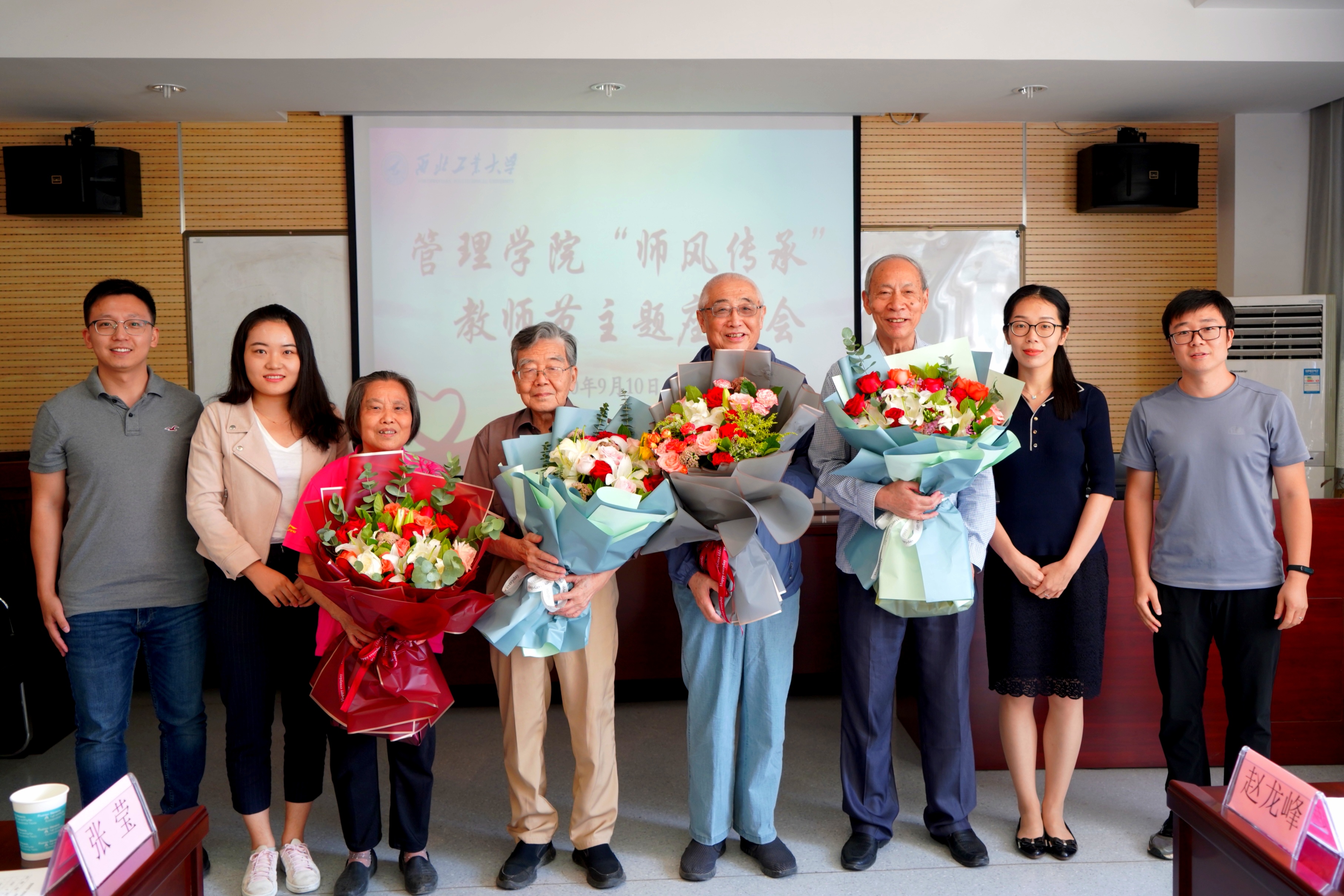 最后,青年教师代表向四位老教师献上鲜花,老教师也代表学院给全体青年教师赠送礼物。以激光笔喻戒尺、教鞭,既是传承教育之鞭也是鞭策上进之意。意在希望各位青年教师在接过这份育人之鞭后,能像老前辈一样,怀着一颗拳拳教育之心,继续为国、为校、为院发光发热。