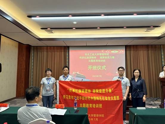 开班仪式上,安阳市委党校副校长杜光华绍了安阳市基本情况和近年来弘扬红旗渠精神、党性教育开展情况。学院党委书记乔彩燕谈到,“红旗渠精神”是中国共产党人精神谱系的重要组成部分,始终闪耀着历久弥新的时代光芒,此次研学,既是精神传承,也是对主题教育总要求的践行,希望大家珍惜学习机会,深刻把握红旗渠精神的核心要义和时代价值,当好红旗渠精神的坚定传承者,切实把学习成果转化为推动实际工作的精神源泉。随后,杜光华和乔彩燕共同向研修班授班旗。