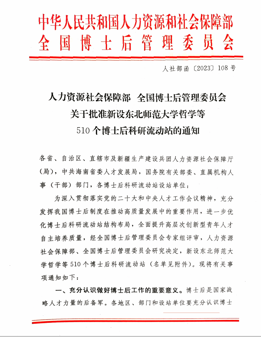 近日,人力资源和社会保障部、全国博士后管理委员会联合下发《关于批准设立东北师范大学哲学等510个博士后科研流动站的通知》(人社部函〔2023〕108号),小奶猫直播