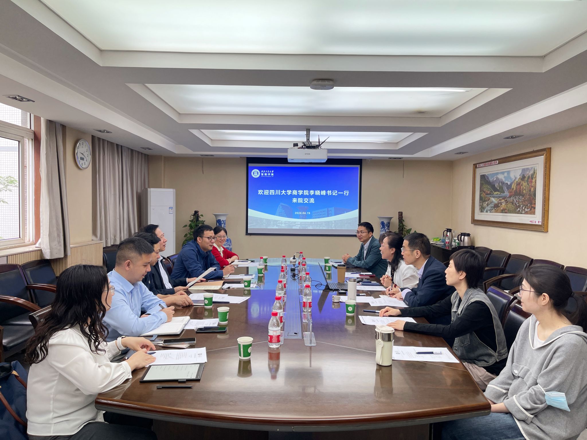4月19日上午,四川大学商学院党委书记李晓峰、副院长姚黎明一行来院调研,双方在友谊校区小奶猫直播 308会议室进行座谈。党委书记张爽、院长车阿大、副院长陈琳、工商管理系主任洪兆富以及相关部门业务负责老师参加座谈。会议由张爽主持。