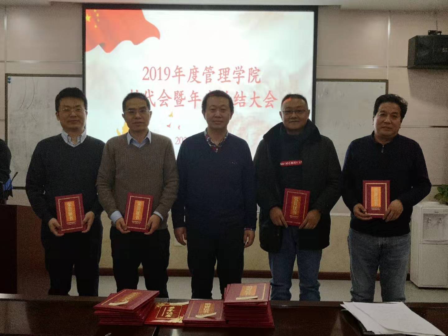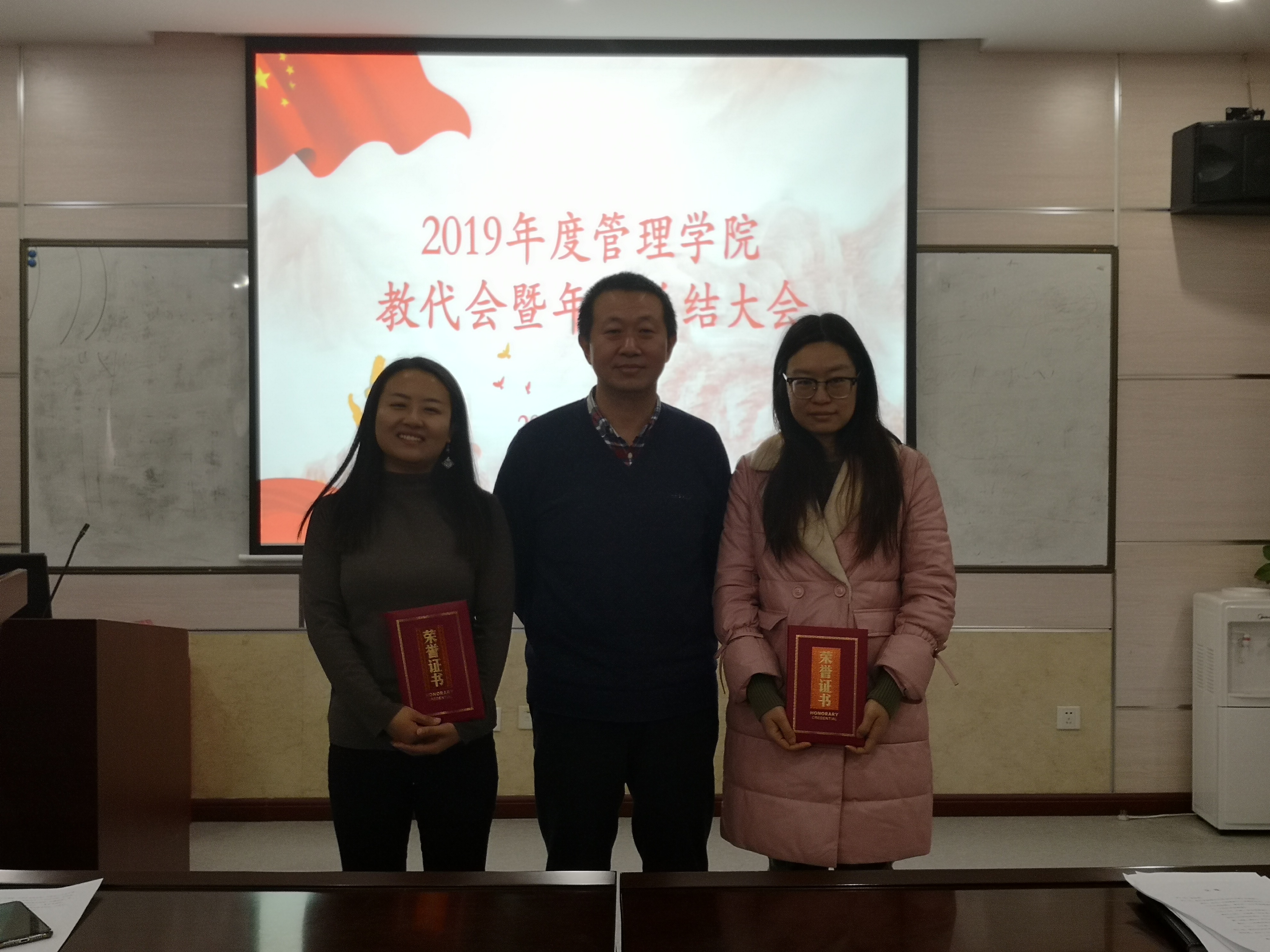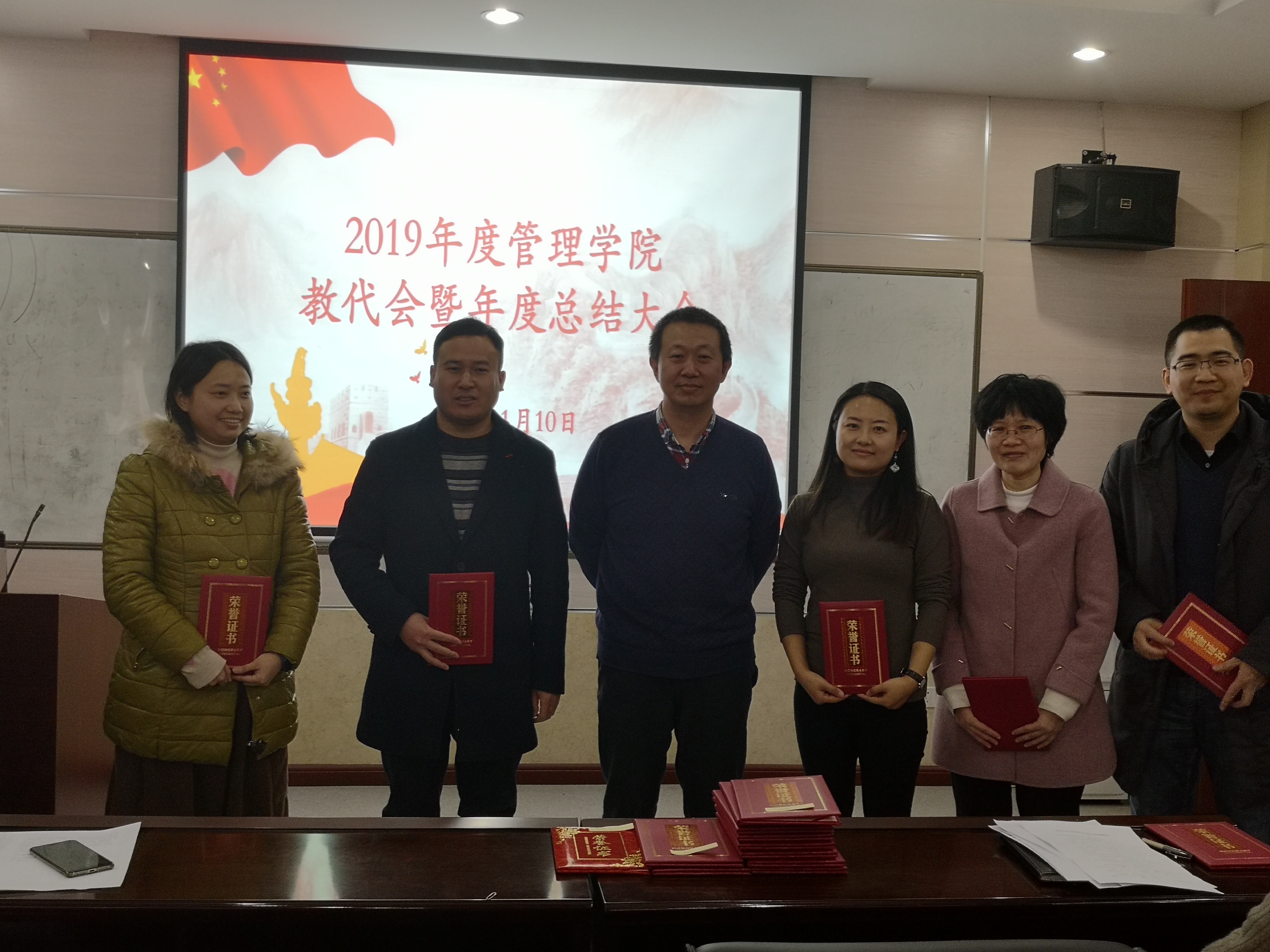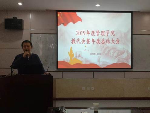 教代会在庄严的国歌中拉开序幕。会议首先由郭云涛介绍2019年新入职教职工。2019年学院共有4位新教师入职,他们分别是实验教学中心助理研究员陈志老师、会计系助理教授刘慧老师、谢光华老师以及专职科研岗孙晔飞教授。随着学院业务扩展和管理服务需要,2019年学院招聘非事业编制行政服务人员9名,新入职人员依次上台自我介绍。2019年学院各项工作均取得较好成绩,贾明宣读了学院2019年度光荣榜,学院领导为获得2019年度学院“学科建设先进个人”“优秀系主任”“优秀党支部书记”“优秀本科生班主任”的教师颁发了荣誉证书。
