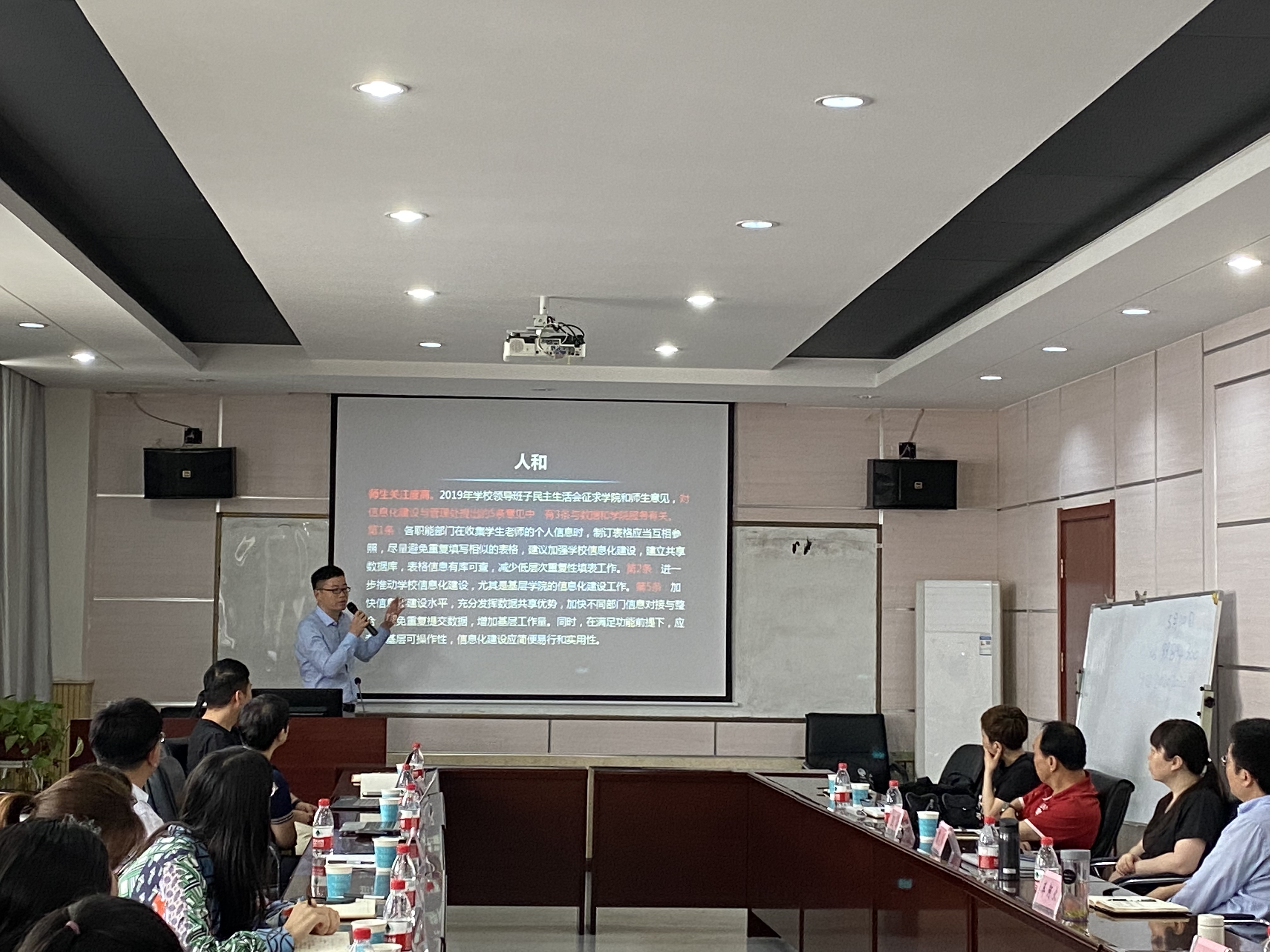 召开信息化建设专题研讨会,信息化建设与管理处处长薛静、副处长张文生、信息化办公室主任冯欣艳、数据管理办公室主任肖琳、数据管理办公室人员,以及学院书记乔彩燕、院长车阿大,副院长贾明、陈琳、郭云涛、副书记曹子尧、院长助理田庆锋、各部门相关业务的老师、教师代表薛建武教授等出席了此次会议。会议由乔彩燕主持。