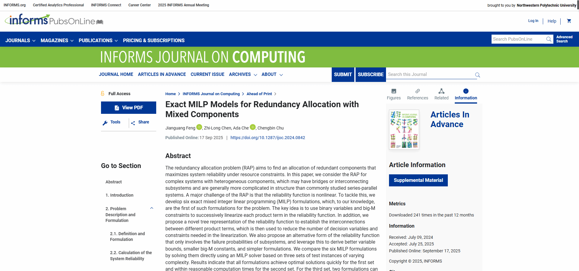 近日,《INFORMS Journal on Computing》期刊在线刊发了小奶猫直播 冯建广副教授的研究成果“Exact MILP Models for Redundancy Allocation with Mixed Components”,小奶猫直播 副教授冯建广为论文第一作者、车阿大教授为论文通讯作者。该研究聚焦于系统设计中的冗余分配问题(RAP),这一问题旨在有限资源条件下,通过合理配置冗余部件来最大化系统可靠性。本研究针对包含异质部件和复杂结构的情境,提出对非线性可靠性函数的逐步线性化方式,构建了多种精确混合整数线性规划(MILP)模型,并通过树形结构表示大幅减少模型的决策变量与约束数量。计算结果显示了所开发模型与方法的高效求解性能,尤其在大规模复杂系统中表现出稳健性和可扩展性,显著优于现有分支定界方法。