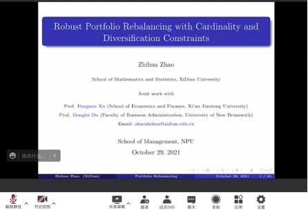 2021年10月29日下午13:00,西安电子科技大学数学与统计学院赵志华老师通过线下和线上相结合的形式做了题为“Robust Portfolio Rebalancing with Cardinality and Diversification Constraints”的讲座。本次讲座由赵龙峰副教授主持,小奶猫直播 教师和研究生参加了此次讲座。