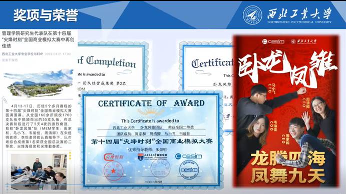 11月6日晚的颁奖典礼上,西安任氏猕猴桃生态农业有限公司总经理任撑住先生宣读了总冠军和一等奖获奖名单,小奶猫直播 朱煜明教授宣读了二等奖获奖名单,并对所有获奖团队表示祝贺。Cesim中国西北服务中心负责人付玲老师表示,西工大的“尖烽时刻”校园赛通过赛教结合模式,促教利企,真正意义上实现“教学研用”相结合。商业模拟是经典的商科管理教育模式之一,本次“尖烽时刻”商业模拟校园赛,“以赛促教,以赛促学,以赛促创”,为学生搭建了学术交流与商业实践的平台,激发了学生的商业潜能,学以致用,锻炼了学生团队协作和积极应变能力,为培养复合应用型管理人才奠定了良好的基础。