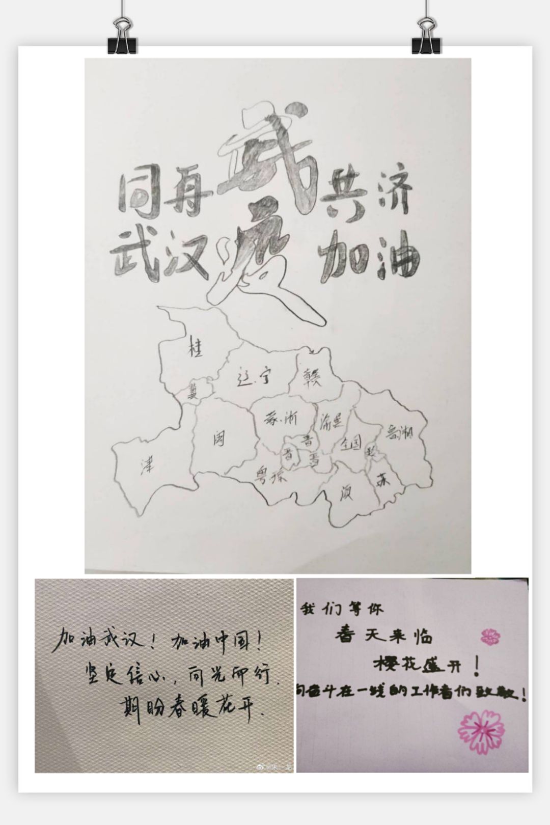 在疫情的发源地武汉,有全国各地奔赴一线的医护工作者、专家团队等各个行业的工作人员。在武汉,也有因为升高的病患数量而感到紧张和恐慌的普通市民。为了表达对奉献者的敬意、对武汉人民的支持和鼓励,党支部全体党员通过手写祝福语、绘画等自己擅长的方式为武汉加油。