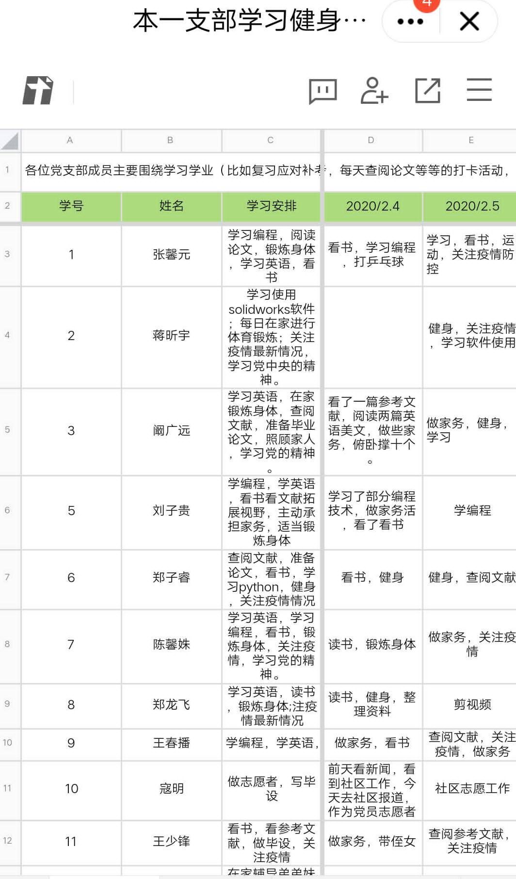 停课不停学,身为学生,学习就是主业。疫情期间,支部开展线上打卡活动,号召支部党员制定学习计划,并通过填写线上表格的方式记录每天的计划实施情况,达到互相监督、互相督促学习的效果。自2月4日起,全体党员坚持每天记录分享自己的一天,共同锻炼身体、补充知识。