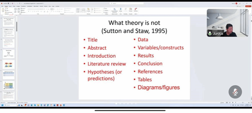 美国德克萨斯大学达拉斯分校Jindal商学院战略管理系夏军(XIA Jun)教授线上讲授了《组织和战略理论》前沿课程,从“什么不是理论”这个引人入胜的话题切入,围绕“论文的各个部分是否为理论”这一问题,进而提出自身对理论以及如何构建理论的理解,并讲述了在学术研究中如何应用理论、如何作出理论贡献等。夏军强调,每个学者都有最符合自己思维模式和研究兴趣的理论,可以选择在自身最有天赋和感触最深的某个理论领域深耕;也可以选择从现象入手,广泛地学习和结合多种理论进行研究。