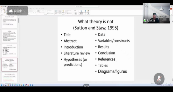 课程中,夏老师从“什么不是理论”这个引人入胜的话题切入,通过围绕“论文的各个部分是否理论”这一问题,进而提出自身对理论以及如何构建理论的理解,并讲述了在学术研究中如何应用理论、如何做出理论贡献等。夏老师强调,每个学者都有最符合自己思维模式和研究兴趣的理论,可以选择在自身最有天赋和灵感的某个理论领域深耕;也可以选择从现象入手,广泛地学习和结合多种理论。