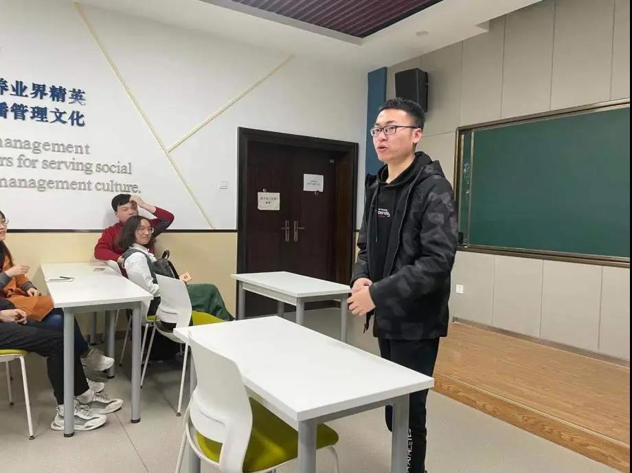 )发言。胡溪洋同学结合自身参加科技竞赛的经历,给大家分享了竞赛保研的政策和注意事项,并鼓励工程管理专业的同学积极参加项目管理大赛,同时也对保本校和保外校的利弊进行了分析。