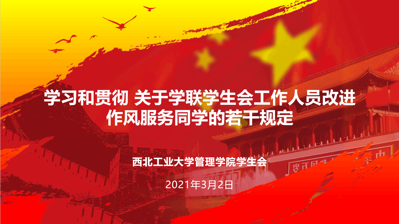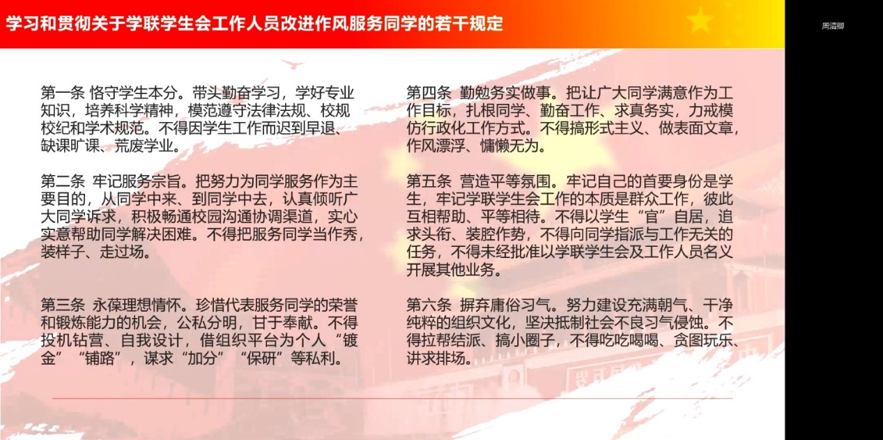 随后团委副书记周清卿就《关于学联学生会工作人员改进作风服务同学的若干规定》展开解读,强调同学们要恪守学生本分、牢记服务宗旨、永葆理想情怀、勤勉务实做事、营造平等氛围和摒弃庸俗习气,以更高的标准要求自己,在日常工作中不断提升个人政治素养,鉴定全心全意为广大同学服务的信念。