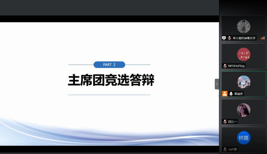 接下来,参与研会主席团竞选的同学按照抽签顺序依次进行了线上答辩。每位同学分别从个人情况、竞选原因和工作总结做了介绍。此外,他们还详细阐述了自己对研究生会未来工作的规划。同时,各位主席团成员也针对每位同学的不同情况依次做出指导,提出了建设性的意见。