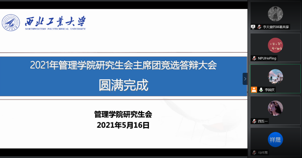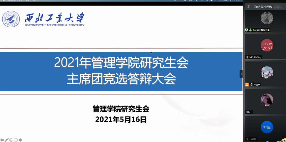 2021年5月16日晚7点,小奶猫直播 研究生会总结表彰与主席团竞选答辩大会以线上会议形式成功举办。本次会议由小奶猫直播 研究生会主席团成员担当评委,主席团竞选人和研会成员共同参加。