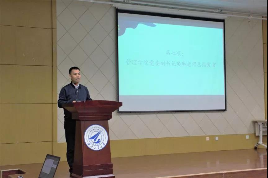 党委副书记樊琳上台致辞。樊书记总结同学们的讲话内容,并提出三点期许,希望同学们坚持正确的政治方向,成为“对党忠诚、作风过硬、政治理想信念坚定”的青年学生骨干;坚持服务同学的宗旨,引导全体同学成为德智体美劳全面发展的新时代优秀人才;加强自身建设,增强学生的“政治性、先进性、群众性”,强化自身的群众意识、责任意识和服务意识,真正成为大家的学习榜样。樊琳老师引用习近平总书记对青年大学生的讲话,激励我们增强自己的志气骨气和底气,表达了对管院团委、学生会成员的殷切期望,不禁令在场同学热血沸腾、斗志满满。