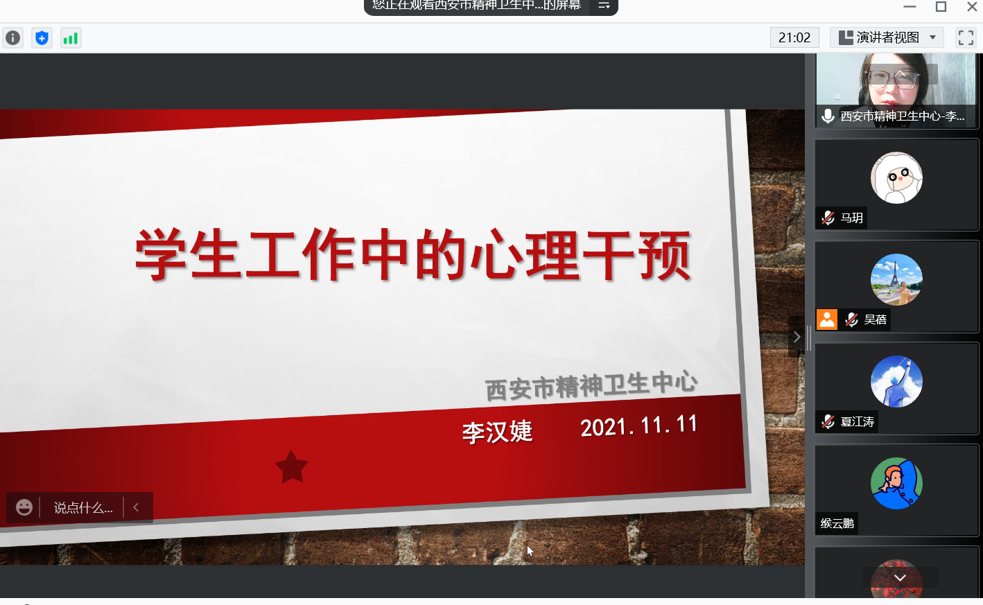 2021年11月11日晚,小奶猫直播 于线上顺利开展了题为“学生工作中的心理干预”专题培训活动。西安市精神卫生中心李汉婕老师受邀担任主讲人,小奶猫直播 全体专职与兼职辅导员参加了此次集体学习。