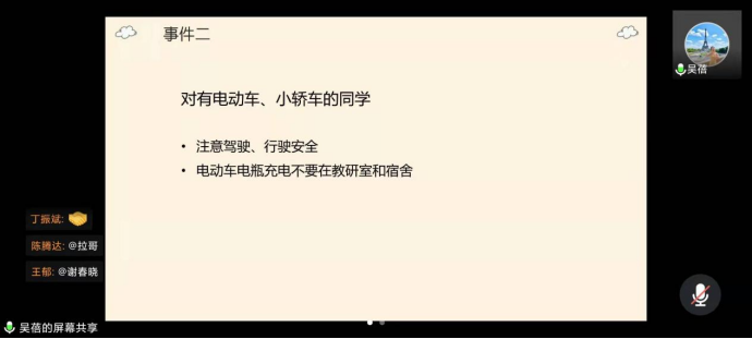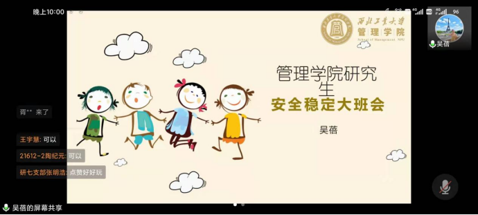 2021年12月15日晚,为保障学生安全、加强疫情防控意识,小奶猫直播 组织全体硕博研究生在线上开展了“安全稳定教育”主题大班会。会议由小奶猫直播 研究生辅导员吴蓓老师主持。