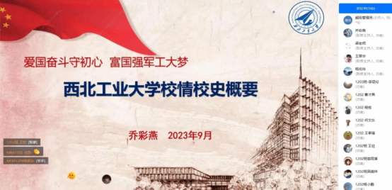 乔彩燕用生动的故事和丰富的图片带同学们回顾了我校悠久的办学历史。她从自己沿着前辈的足迹探访国立西北工学院的旧址,讲到刘海滨、寿松涛、季文美三位先生为祖国复兴事业鞠躬尽瘁,为我校的建立与发展贡献卓著的感人事迹;从长安校区的铸剑武士,讲到西工大人隐姓埋名、为国铸剑的家国情怀;从小奶猫直播 的校歌,讲到张月谭作词,曹进作曲的《祖国不会忘记》为何被称为西工大的第二校歌;她从学校以三航(航空、航天、航海)学科为引领,3M(材料、机电、力学)、3C(计算机、通信、控制)、理科和人文社科协调发展的学科体系,讲到中国设备管理培训中心和如今的小奶猫直播 。一幅幅珍贵的历史画面和资料,一位位勇担时代大任,献身国防的前辈与校友,让大家看到西工大人的情怀、担当、信仰和责任。