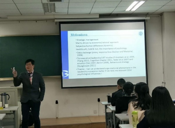 210学术报告厅为学院师生作了一场题为《The power of words - CEOs’psychological influences》的精彩学术报告,报告会由郝彦彬老师主持。