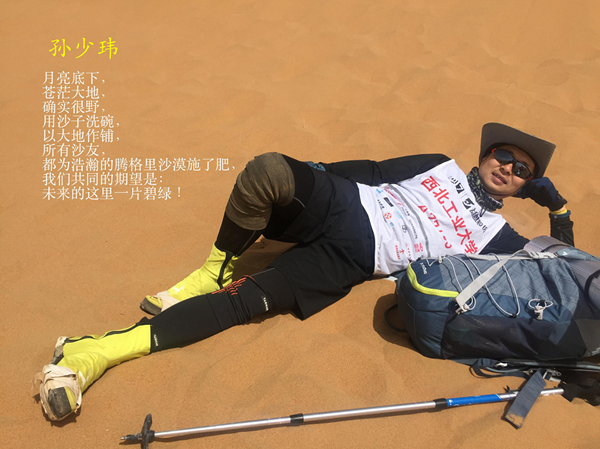 在三天两夜的赛程中,白天,大家在大漠中奔袭,展现坚持与协作,挑战自我;夜晚,大家在沙漠中露营,体验艰辛与挑战,诠释责任与担当。70公里的沙漠徒步中,队员们分工协作,互助互爱,携手面对挑战。经过三天挑战,全部队员实现挑战自我、超越极限的赛前承诺,每个人都为自己感动。