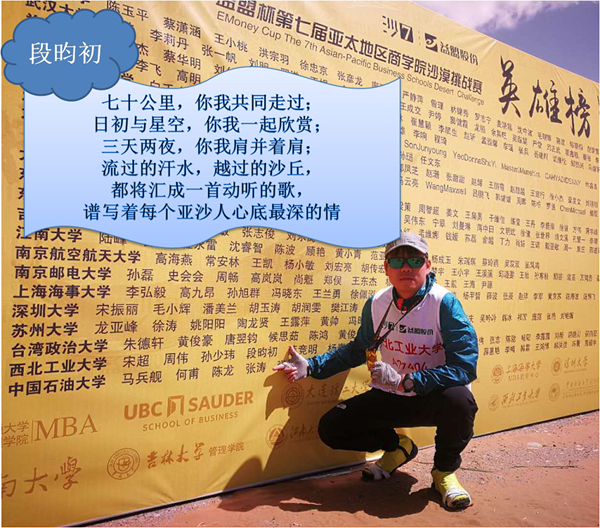 对MBA、MEM专业学位学生来说,亚沙不仅仅是一场户外比赛,更是商学院的第二课堂,沙七勇士们在亚沙赛场上体验了书本和课堂中无法获得的感受与历练。选择与强者同行,跑过的每一个脚步都有意义。