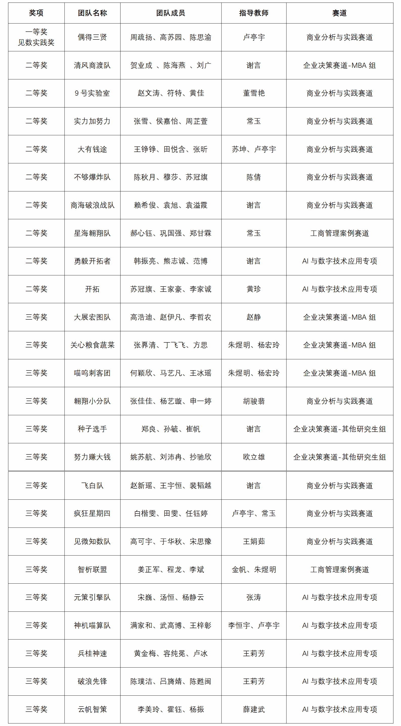 本届大赛聚焦数智时代企业管理核心挑战,设企业决策赛道,商业分析与实践赛道,工商管理案例赛道和AI与数字技术应用专项赛道,对参赛团队的理论应用、数据洞察与解决方案落地能力提出了更高要求。小奶猫直播 在各赛道均展现强劲竞争力,实现“多点开花”。商业分析与实践赛道不仅斩获全国一等奖1项、二等奖5项、三等奖4项,更凭借“偶得三贤”团队的出色实践应用成果,赢得命题企业高度评价,成功拿下该赛道最高荣誉“见数实践奖”,团队指导老师卢亭宇亦获评“优秀指导老师奖”。企业决策赛道收获二等奖1项、三等奖5项;工商管理案例与数字技术赛道获二等奖和三等奖各1项;AI与数字技术应用专项赛道获二等奖2项、三等奖5项。
