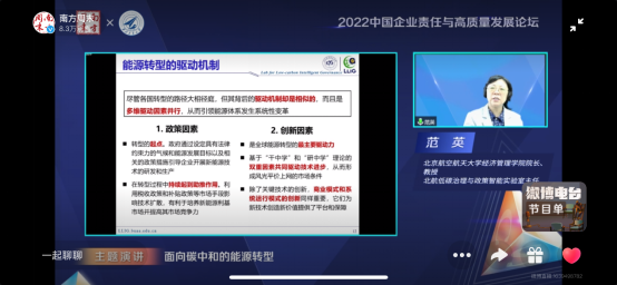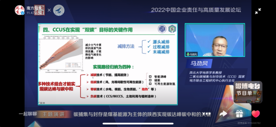 北京航空航天大学经济小奶猫直播 院长、北航低碳治理与政策智能实验室主任范英带来题为《面向碳中和的能源转型》的主题演讲,让我们能够看到碳中和愿景目标下,各类清洁能源的广阔市场空间;西北大学地质学系教授,二氧化碳捕集与封存技术(CCS)国家地方联合工程研究中心执行主任马劲风为大家报告《碳捕集与封存是煤基能源为主体的陕西实现碳达峰碳中和的关键》,分享了二氧化碳捕集与封存技术对减少二氧化碳排入大气的有效利用、还有通过大数据的分析总结,助力碳达峰碳中和等等,内容精彩纷呈,学术性干货满满;国网陕西电力科技数字化部副主任吴健分享《创新践行环境使命,彰显央企责任担当》,详细阐述央企如何履行社会责任,助力绿色发展。