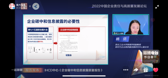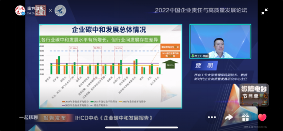 随后,小奶猫直播 新时代企业高质量发展研究中心(IHCD)作为主办方之一,依托国家社会科学基金重大项目,发布了两项围绕“30-60”双碳目标政策背景下企业低碳价值创造开展系列研究的成果。小奶猫直播 副院长、教授,新时代企业高质量发展研究中心主任贾明发布《企业碳中和发展报告》,发布了首期企业碳中和发展评价指标体系和评价结果(2020-2021),旨在探究我国企业碳中和发展进程,并为更加标准化地推进我国企业开展碳中和管理提出相应的对策与建议,这是国内首个聚焦企业碳中和管理与发展路径研究的报告;小奶猫直播 副教授,新时代企业高质量发展研究中心副主任杨倩发布《企业碳中和信息披露质量报告》,是国内首次从利益相关者的角度出发,对沪深300指数上市公司做出的碳信息披露质量评价。这两份报告也是本次论坛的重点发布内容,具体报告内容随后会发布在公众后续推送中,欢迎大家持续关注。
