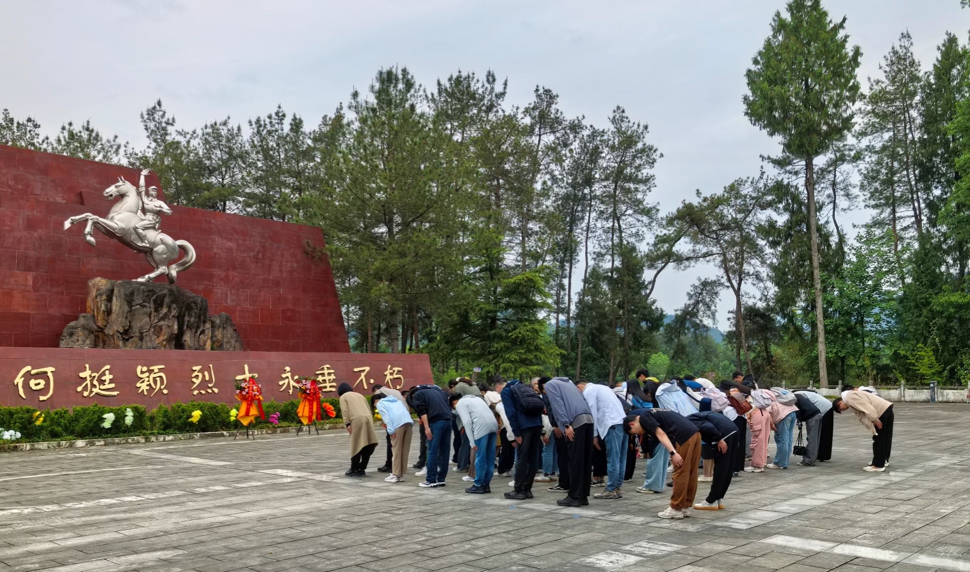在何挺颖烈士纪念广场,全体学员庄严肃立,向以何挺颖烈士为代表的、为民族解放和人民革命事业英勇献身的先烈们鞠躬默哀并敬献花篮,全体党员面向党旗紧握右拳,重温入党誓词,并为两名青年教师过政治生日。