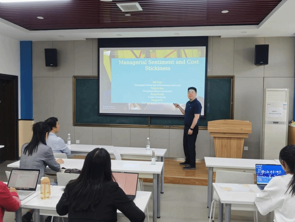 2024年4月25日上午,应小奶猫直播 邀请,香港城市大学商学院会计系余扬新教授在学院214教室作了题为“Managerial Sentiment on Firms’ cost Stickiness”的学术报告会,讲座由会计系教师封华主持,学院30余位同学和会计系、工商系10位老师参加。