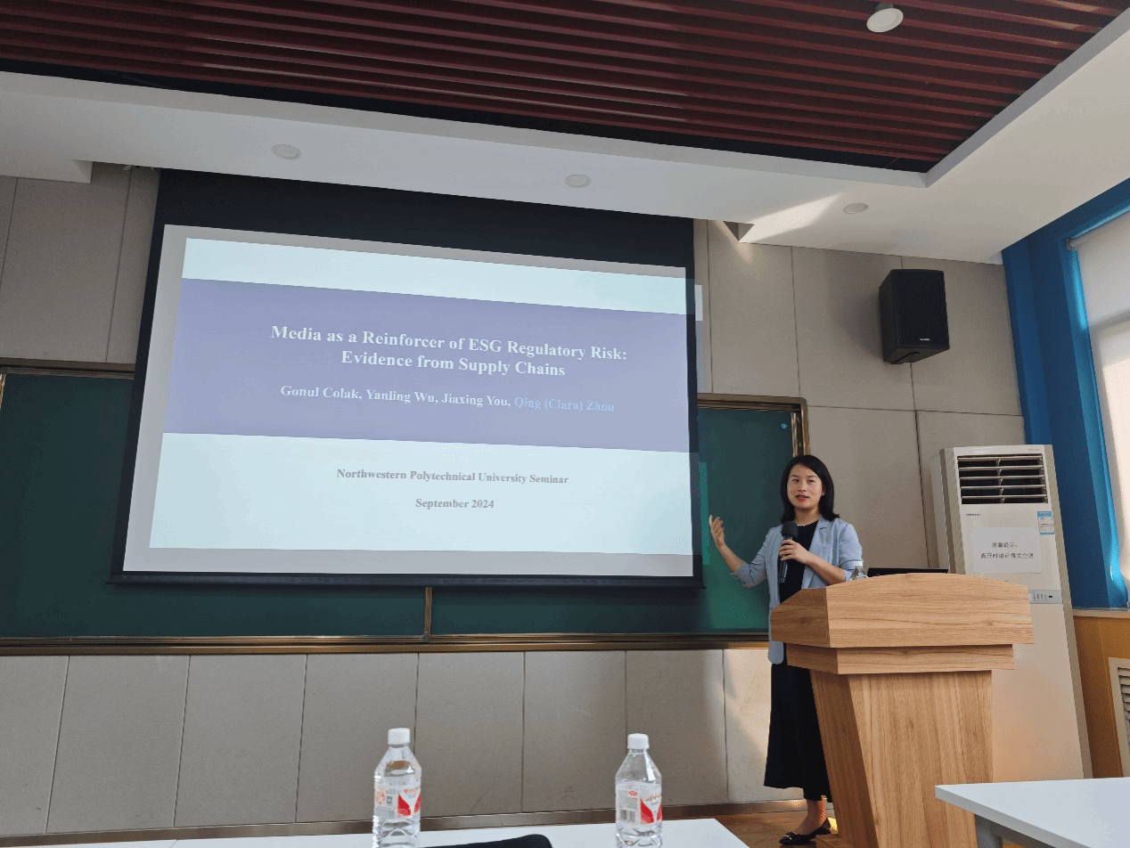 会议开始前,田皓文对周青的个人情况和学术成果进行了简要介绍,参会师生对她的到来表示了热烈欢迎。周青介绍,在对供应链中ESG实践的监管审查日益严格的背景下,供应商ESG风险已成为下游企业的重要考量因素。研究分析了2001年至2021年期间,来自495家主要中国报纸的负面环境媒体报道对采购决策的影响。研究结果表明,在2015年巴黎协定后,在来自国有媒体的负面报道中,企业对被负面报道的供应商的采购量显著减少。周青表示来自国有媒体的报道会导致更多的监管行动,这表明监管风险渠道影响了供应链战略。该影响在高发行量的媒体、严重的报道、较少的偏见、强有力的治理以及较低的转换成本下更为显著。本研究强调了媒体、特别是国有媒体,在推动供应链ESG实践方面所发挥的作用。