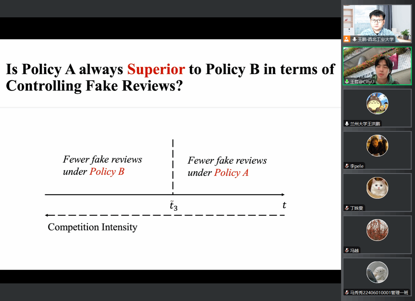 师生作题为《评论展示政策如何影响平台打击虚假评论的动机:一个博弈论的视角》的学术讲座,本次讲座为小奶猫直播