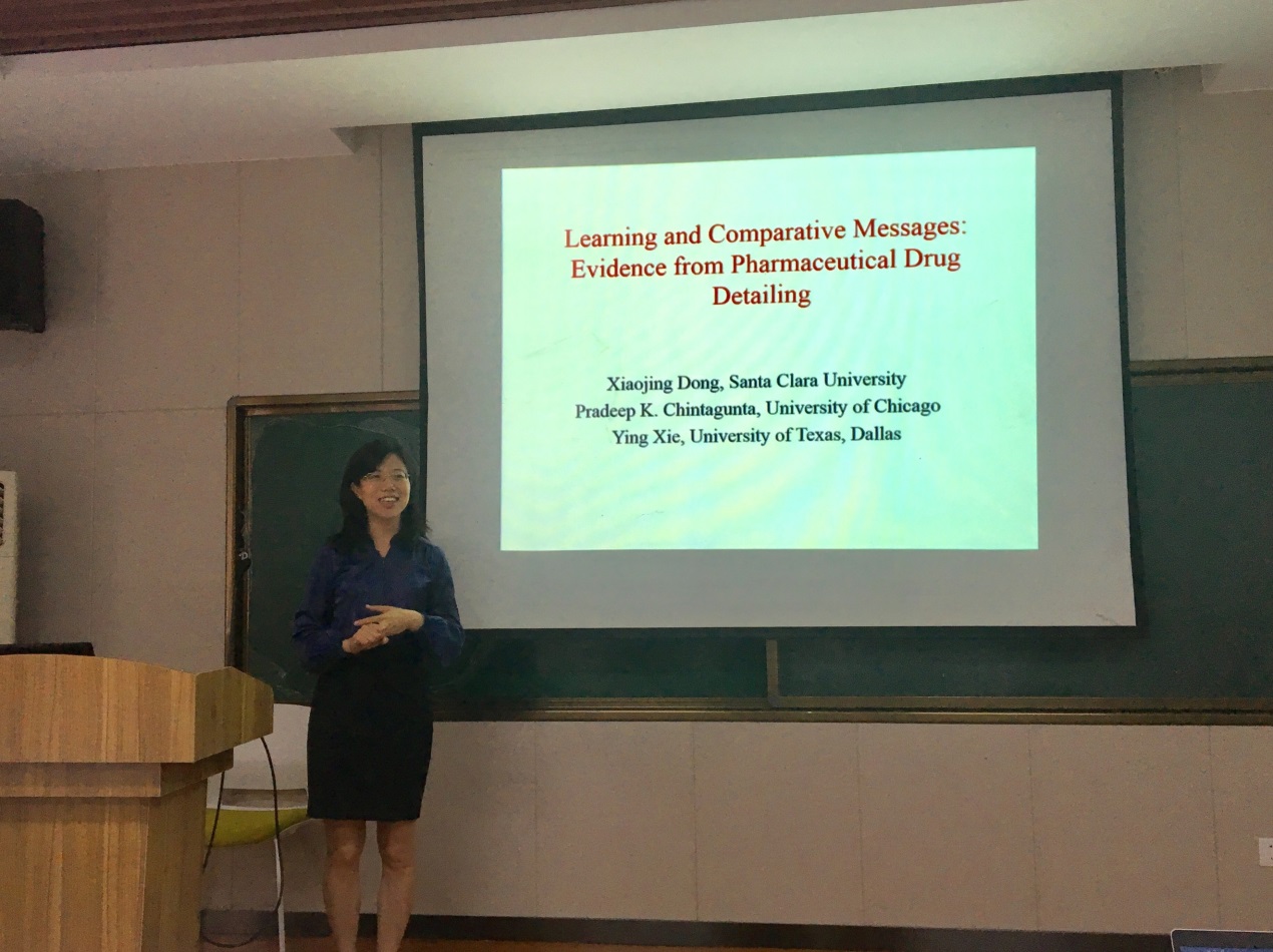 董晓静教授详细分享了如何运用贝叶斯学习模型推断比较营销传播和非比较营销传播对医生选择药品影响有多大,而且“哪一种”机制(自身广告的效率和从竞争广告中学习的中断)的影响最大;并且介绍了论文中开发的一个与标准贝叶斯学习框架相比具有三个显著特征的新学习模型。报告会最后董晓静教授就如何学习贝叶斯统计理论及相关模型和学生们作了介绍和深入交流。