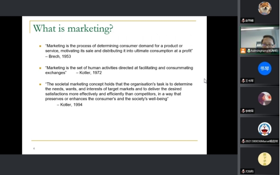 的杭海明教授为我校学生讲授了暑期课程《国际营销》。本次课程采用远程教学的方式进行,课程共分为4个部分,共计16个学时,全校多名本科生和研究生选修或旁听了本课程。