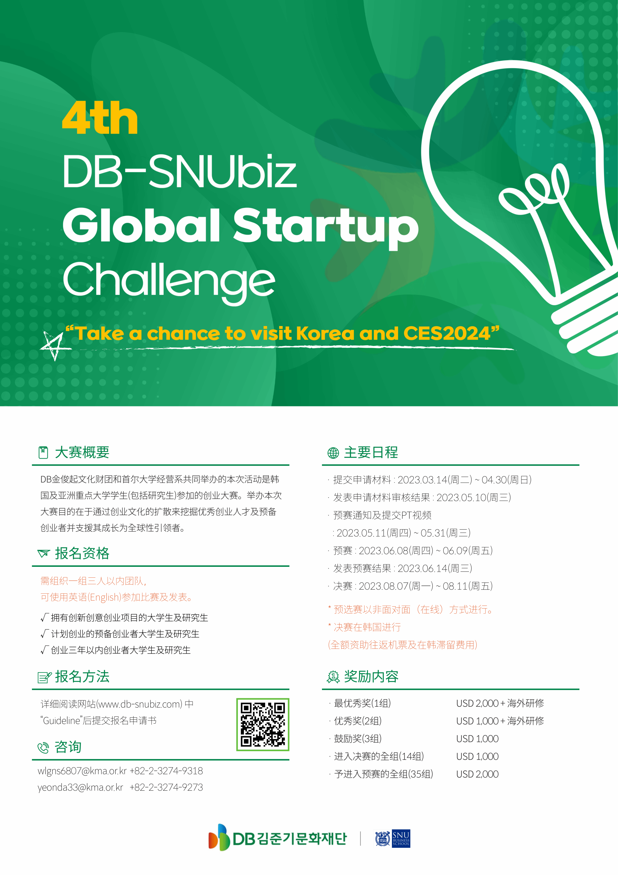【报名通知】DB-SNUbiz Global Startup Challenge 2023(第四届DB文化财团 & 首尔大学全球创业大赛)