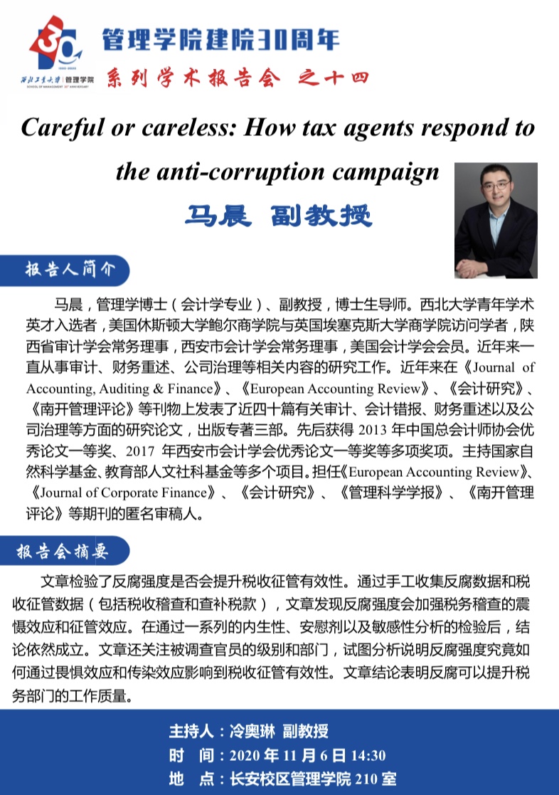 【小奶猫直播 建院30周年系列学术报告会之十四】Careful or careless: How tax agents respond to the anti-corruption campaign