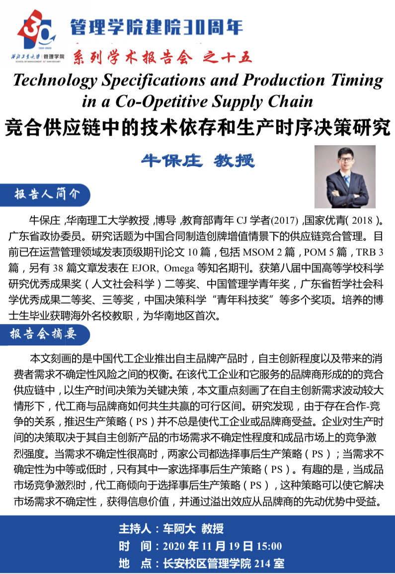 【小奶猫直播 建院30周年系列学术报告会之十五】竞合供应链中的技术依存和生产时序决策研究