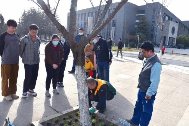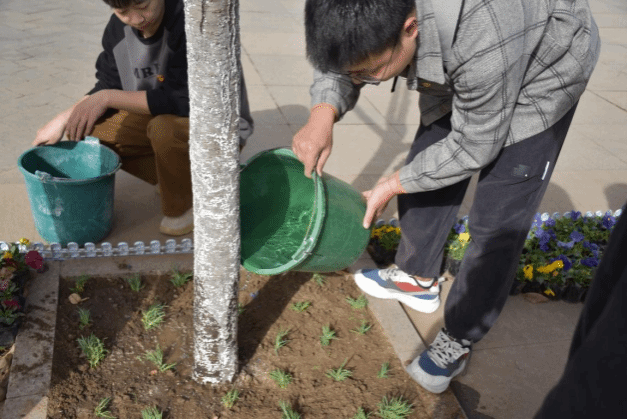 在听完师傅们的讲解之后,参与活动的党员们便分组开始种植,大家都有着不同的分工,挖坑、栽种、浇水,后勤产业集团的师傅们也栽种过程中在不断对大家进行指导。随着种植手法的不断熟练,在学院党员师生的共同参与下,顺利完成了种植任务。