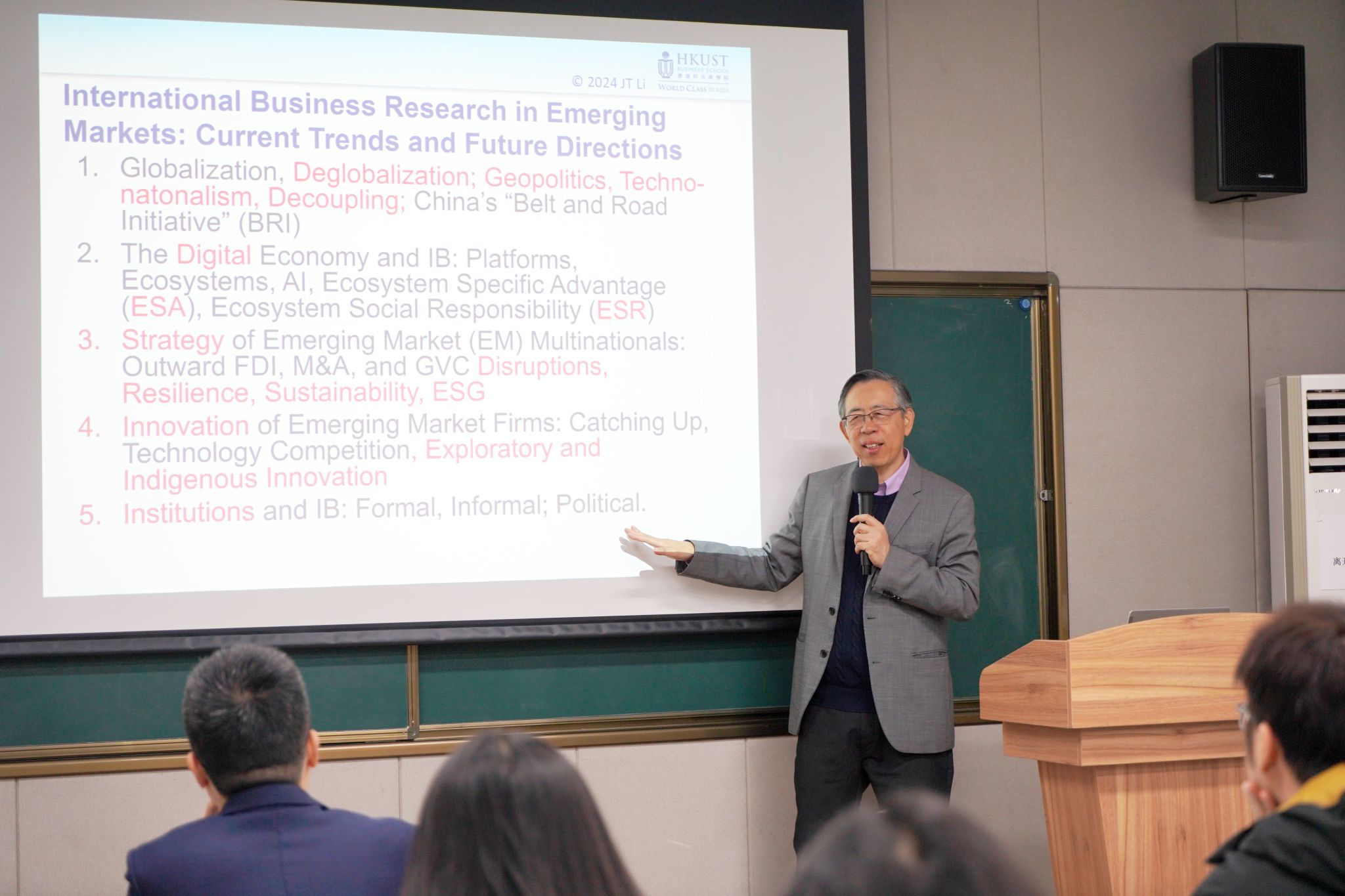 11月18日,香港科技大学李家涛教授深入阐述了新兴市场国际商务领域研究的当前趋势和未来方向,详细介绍了在国际顶级管理学期刊Journal of International Business Studies的五个特刊,强调了开展跨国公司韧性和可持续发展研究、海外投资研究及家族企业出海研究的重要性。
