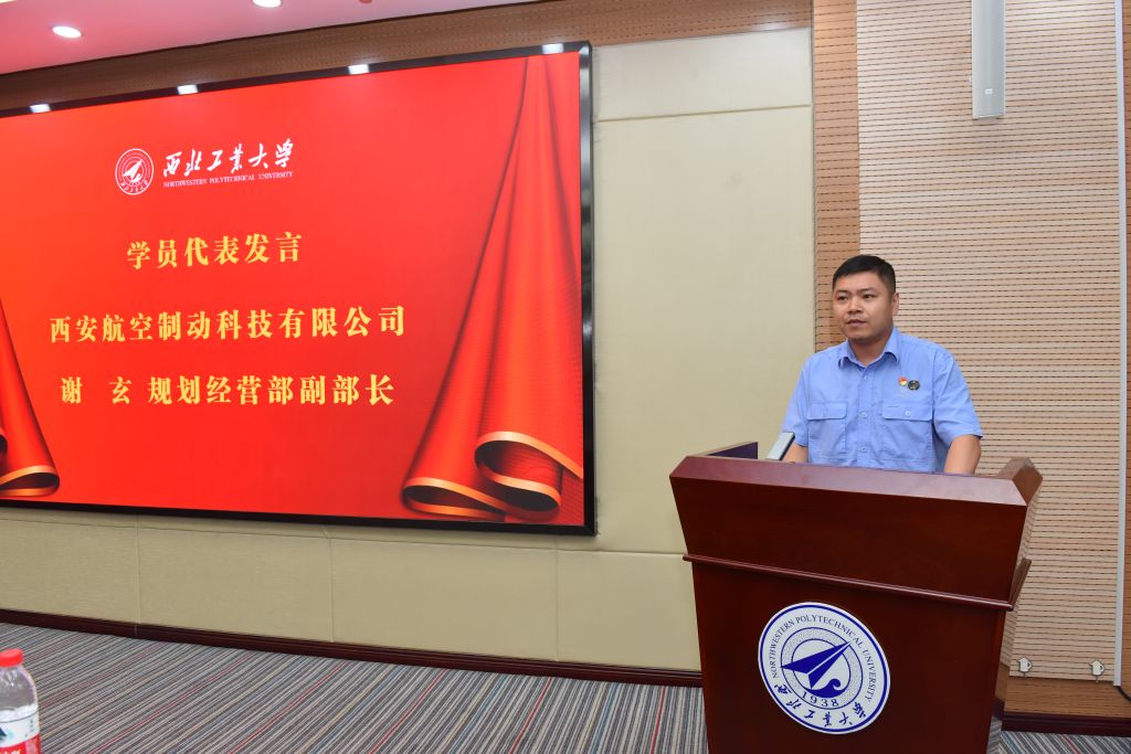优秀学员代表、西安航空制动科技有限公司规划经营部副部长谢玄作为学员代表分享了两年来的学习感受,并感谢公司及学校对自己的培养,他表态在今后的工作中要怀揣责任、不负厚望,在推动航空工业制动高质量发展的新征程上,不断锤炼思想,不断提升自我,践行“忠诚奉献 逐梦蓝天”的航空报国精神。