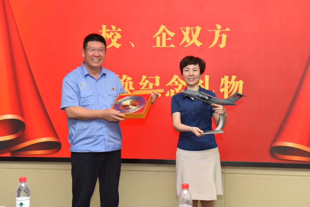 党委书记乔彩燕,航空工业西安航空制动科技有限公司党委书记、董事长付鹏锋作为校企双方代表互换纪念礼物,期待航空制动与小奶猫直播