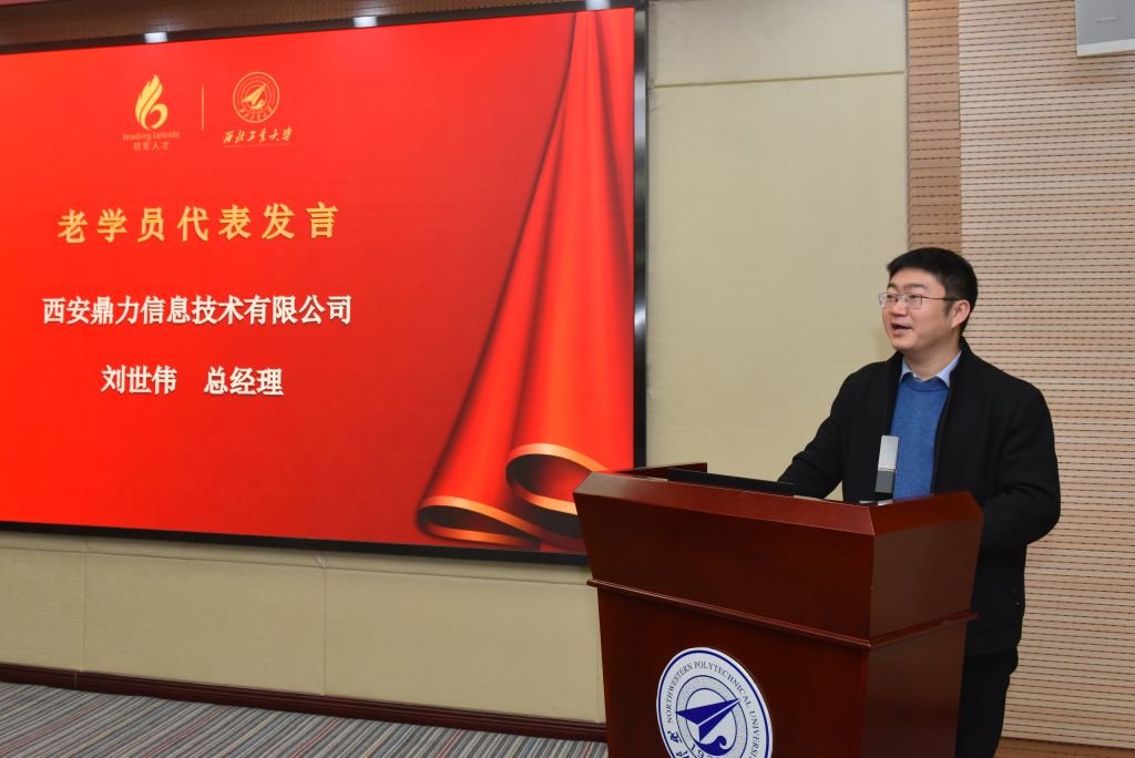 接下来,往届学员代表陕西鼎力信息技术有限公司总经理刘世伟分享了个人和企业在领军人才这个大平台上的所学、所悟、所获,希望领军人不断的推陈出新,不断的进行超越和革新;忠于自己的初心,忠于企业家精神,忠于这个伟大的时代,敢于亮剑,拥抱竞争。也希望学弟学妹收获更多的理论与实践相结合的知识与案例,并能内化成为自己大脑的一部分,在实践中产生效果和效益。