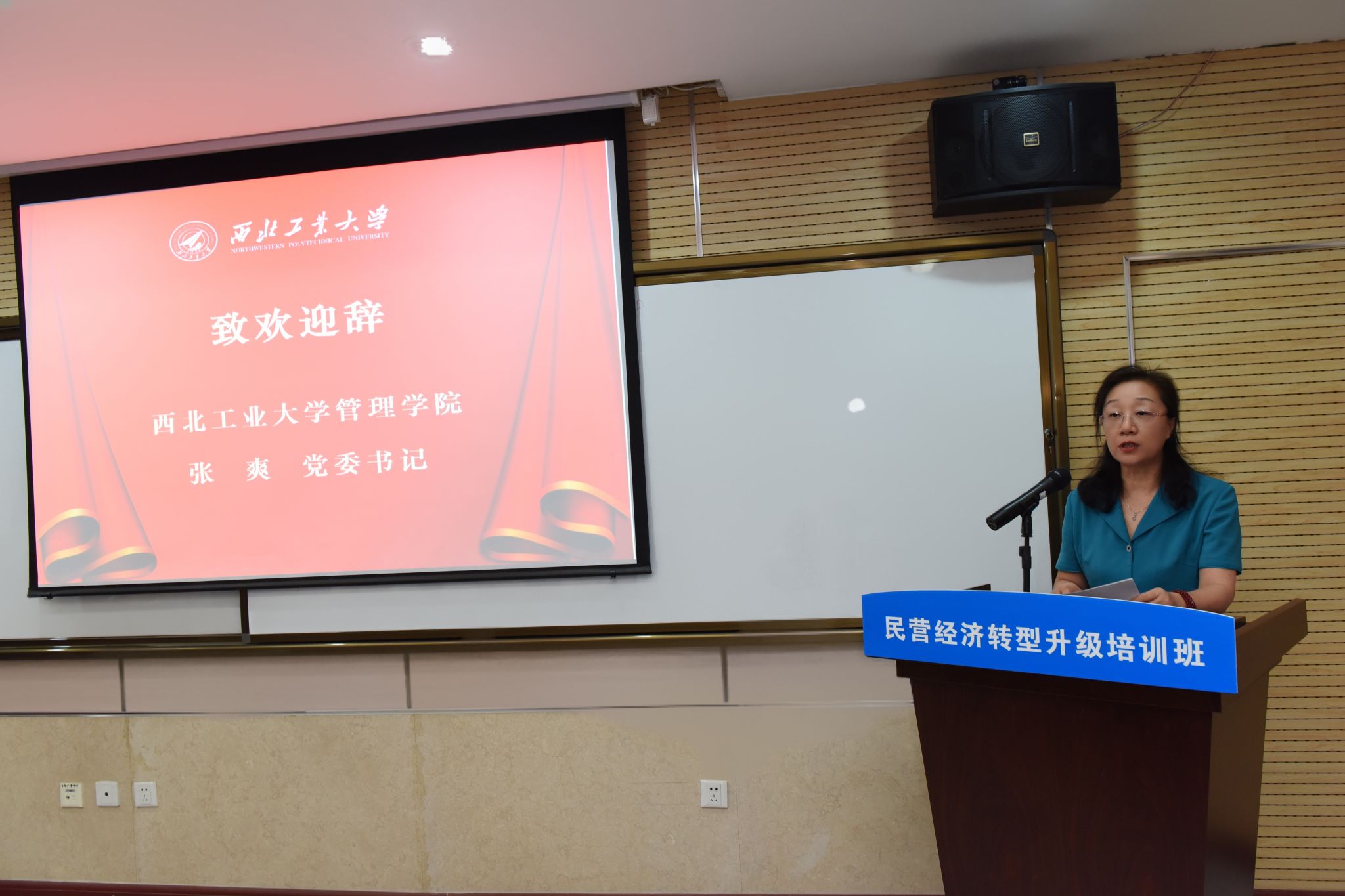 党委书记张爽致欢迎辞,对前来参加学习的培训班学员表示欢迎,并简要介绍了学校和学院的历史沿革、基本情况、学科特色与发展成果。她指出学院对于此次培训高度重视,通过与陕西省工信厅非公经济发展处充分沟通筹备,精心安排了具有前沿性及实用性的课程计划,希望能够帮助和引导参训学员提升理论水平、开阔视野,进一步促进陕西省民营企业转变发展方式,加快转型升级步伐,实现高质量发展。