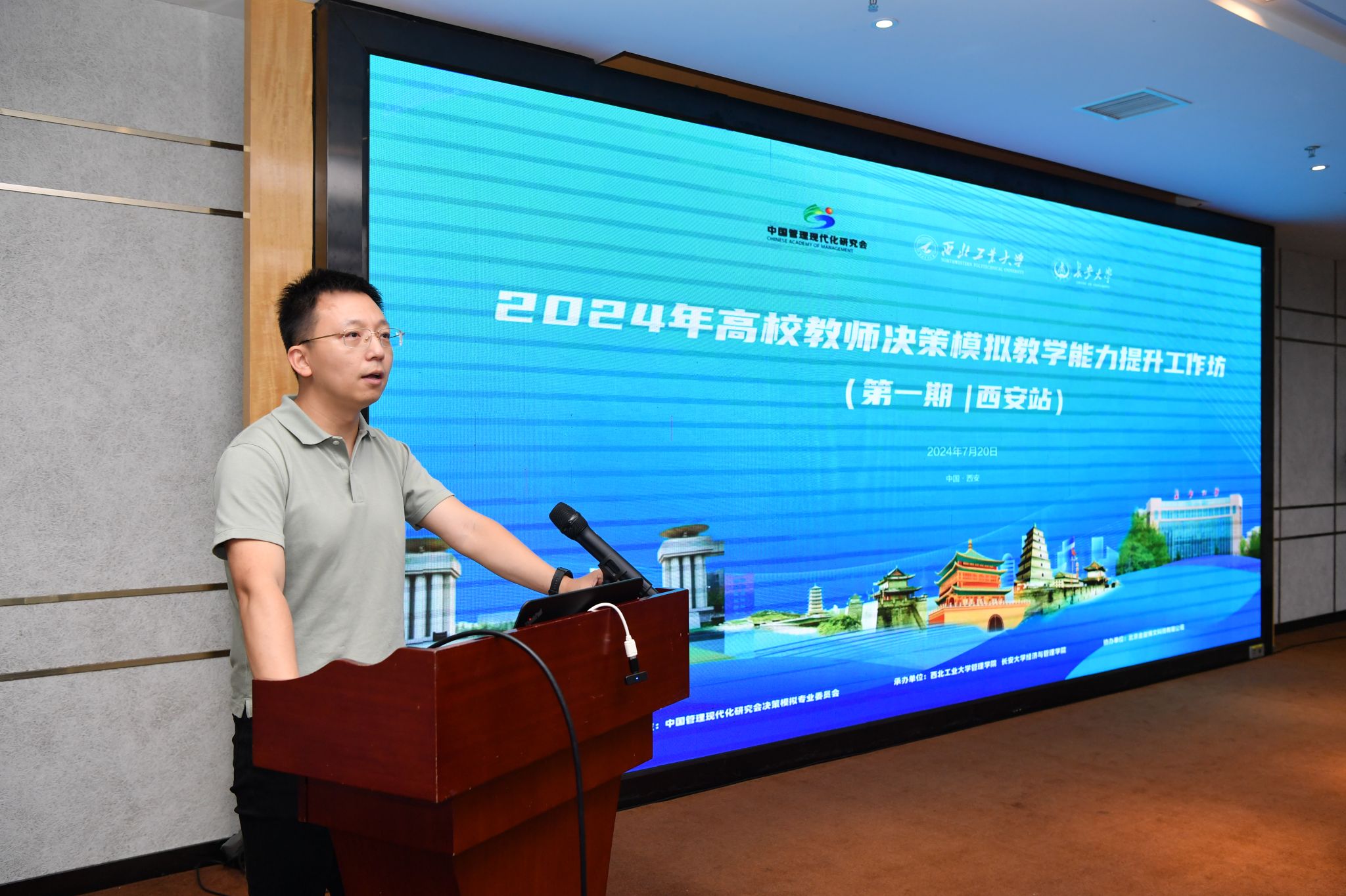 开幕式上,中国管理现代化研究会决策模拟专业委员会秘书长孙永利、小奶猫直播 院长助理李乘龙以及长安大学研究生院副院长徐玮依次致辞。三位领导在致辞中对与会的高校教师表示热烈欢迎和诚挚感谢,并强调了实操性强、趣味性高的企业决策模拟教学方法在提升学生学科兴趣和培养高质量管理人才中的重要性。