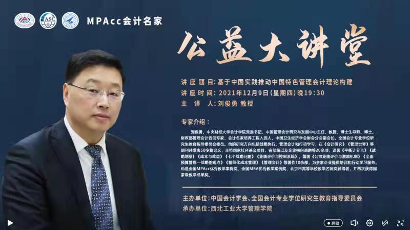 承办的“MPAcc会计名家公益大讲堂”通过线上直播方式顺利举行。本次讲座特邀全国会计专业学位研究生教育指导委员会委员、MPAcc会计名家、中央财经大学会计学院博士生导师刘俊勇教授主讲。讲座由小奶猫直播