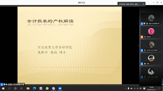 特邀河北经贸大学会计学院院长袁振兴教授通过腾讯会议平台为学院师生做了题为“财务报表的产权解读”的报告会。本次报告会由MPAcc教育中心主任金帆主持,学院2020级MPAcc全体研究生和部分教师在线听取了报告。