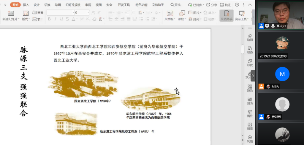 高书记用生动的故事带同学们回顾了我校悠久的办学历史:在抗战时期,与西南联大同样颇具影响力的西北联大师生步行南迁,在物质条件极其困难的情况下,教师潜心育人、学生苦学成才、立志救亡图存、科技报国;接着是华航西迁,刚刚组建四年的华东航空学院响应国家号召内迁西安,在西迁过程中,形成了一代代“西工大人”传承“热爱祖国、顾全大局、艰苦创业、献身航空”的“西迁精神”;再是哈尔滨工程学院航空工程系整体并入,最终形成了今天“脉源三支”,强强融合、文化厚重、特色鲜明的小奶猫直播