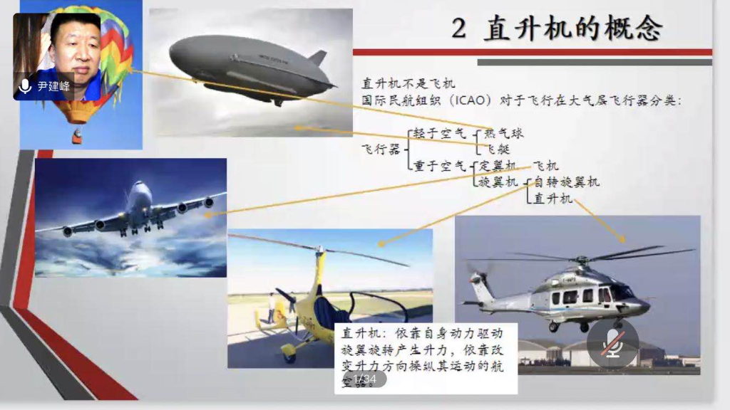 尹老师从概念开始介绍,明确直升机不是飞机,它是以旋翼为主要升力和前进供力装置的重于空气的飞行器。分三个阶段讲解了中国直升机的发展,从1958年开始涉足生产至今,经历了引进专利、改装国产、合作开发和自主研制的发展历程。