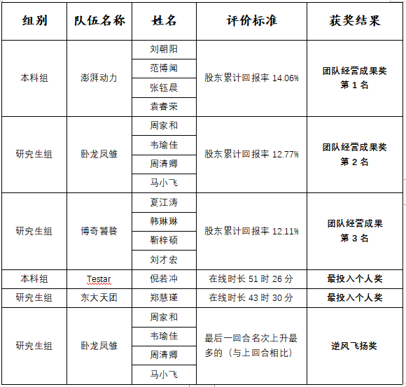 汪焰恩副院长宣读了奖项设置规则和获奖名单,并对所有获奖团队及个人表示祝贺。参加本次大赛的35支团队,经过12个回合的激烈角逐,最终决出澎湃动力、长风翱翔和Seventeen等9支优胜队伍,并评选出倪若冲、郑慧瑾、许轲然等6人获得最投入个人奖;以上队伍依次分享了本次比赛的经验。