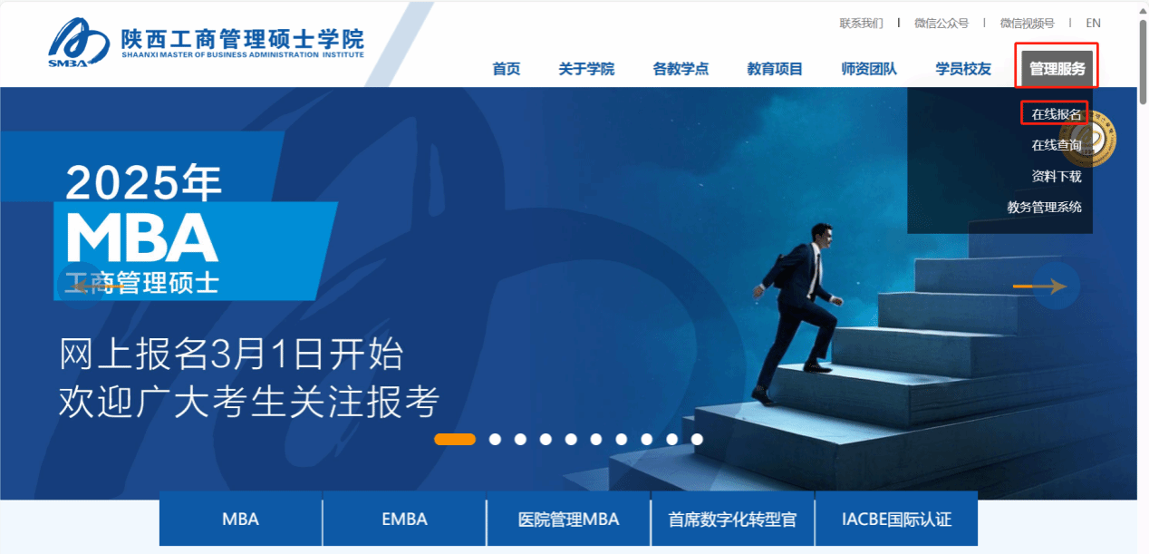 电脑、手机浏览器登录//www.s-mba.com/,点击【管理服务】--【在线报名】