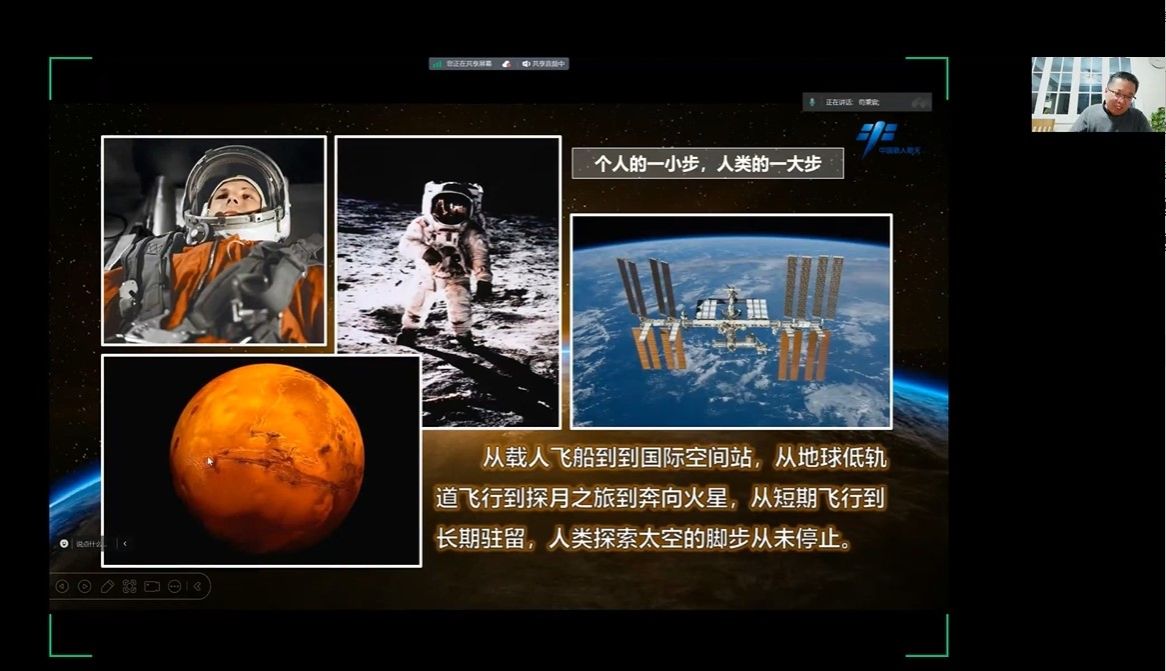 苟秉宸教授以美国航天员拍摄的地球照片为引,讲述了中国航天发展历程,特别是中国的登月任务和中国航天系统从8大系统 到14 大系统的发展过程。在谈到中国载人航天的发展历史时,苟教授详细阐述了国家曾经面临的困境以及“三步走”战略的制定与实施。随着中国经济的腾飞,航天事业取得了举世瞩目的成就,他特别强调了空间站建设的重要意义,深入讲解了中国空间站独特的构型优势及其对人类探索宇宙的重要意义。此外,苟教授还分享了自己在天和核心舱、神十、神十一发射现场珍贵的亲身体验,让同学们如临其境。